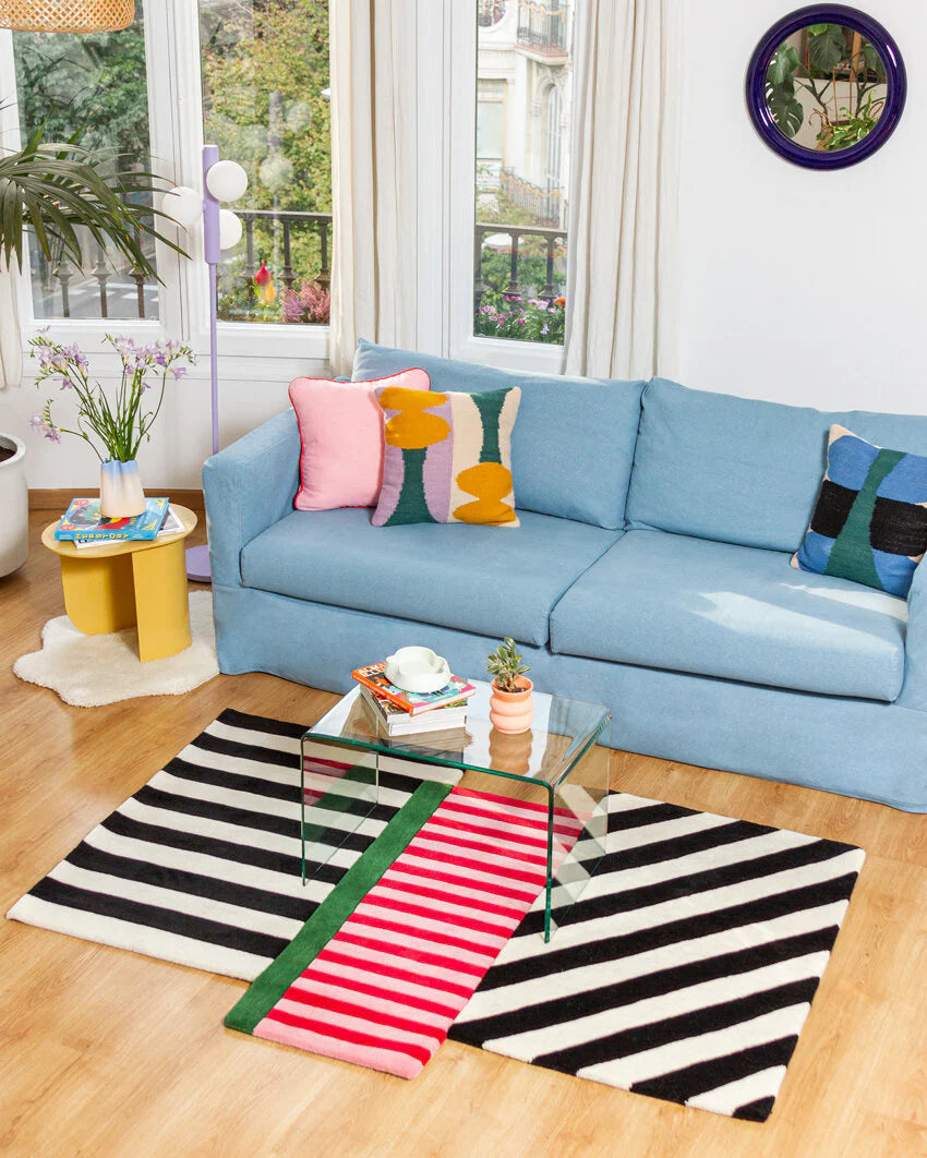 Rankų darbo „Room Service“ vilnonis kilimas. Pagamintas iš 100% Naujosios Zelandijos vilnos. Idealaus dydžio (180 x 120 cm) kilimas jūsų namams.