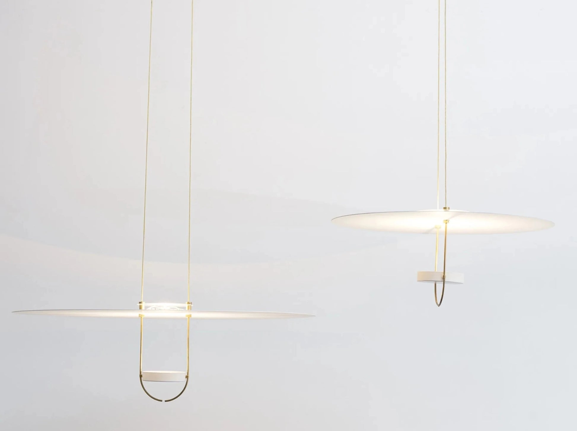 A decorative lamp that will add personality to the entire environment. The main part of the D.03 lamp is a soft white disc suspended by two thin brass or black cables. Both the 50 cm and 70 cm have two powerful LEDs that diffuse perfect and uniform light in the space.