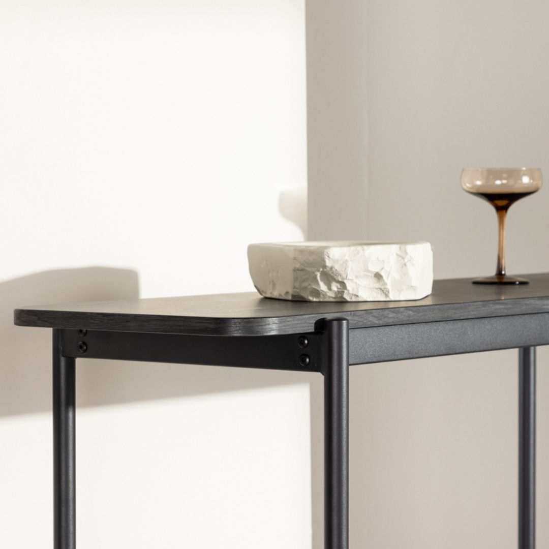 HEIM console - This is a stylish, open shelf console. A minimal design that will fit perfectly into any interior. The black metal frame is combined with black MDF.