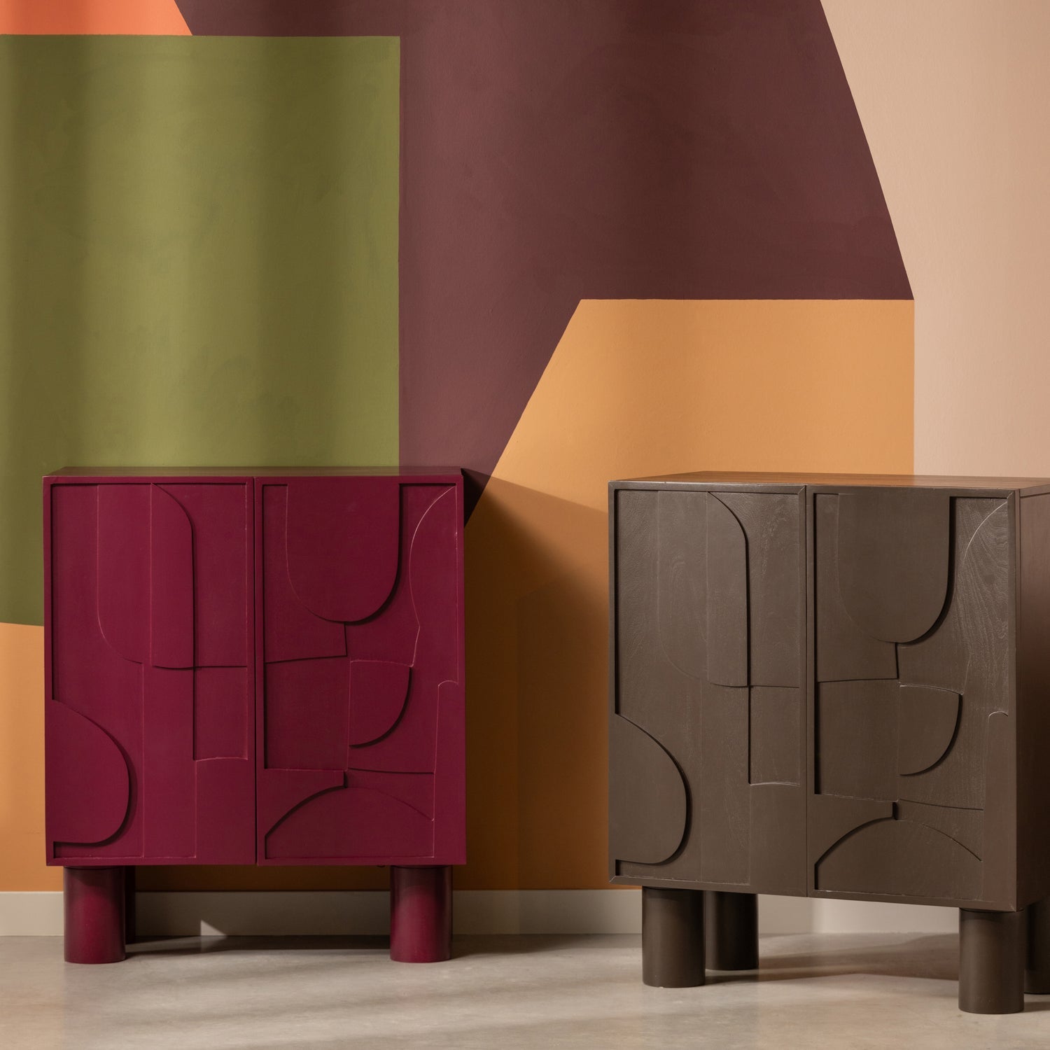 Notice chest of drawers - its doors are decorated with attractive 3D carvings. Cylindrical legs provide a stable stand and a playful look. The doors open using a silent push-to-open system.